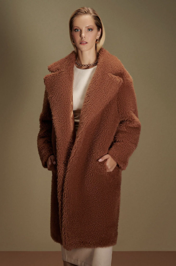 Eco-conscious faux-fur brand N’Onat have answered your fluffy, teddy bear dreams this winter. The Amy coat is made using 100% recycled polyester and is completely fur-free and vegan.